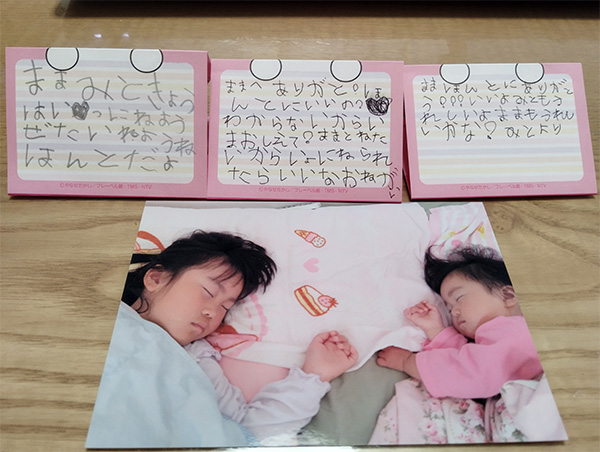 6歳の頃、夜になると当時1歳半だった次女を毎日添い寝で寝かしつけていた私。娘から手紙をもらっていた。「ままきょうはいっ(いっしょ)にねよう ぜたい(ぜったい)ね ほんとだよ」アルバムには覚えたての字で書いたであろう、娘とやりとりした小さな手紙が3枚ずつはさまっていた。そこにはあたたかい約束が交わされていた。